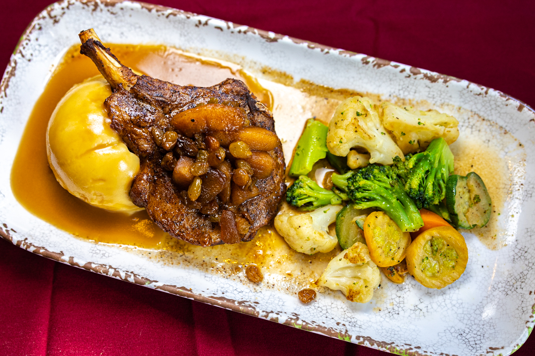 Marinated Sirloin grilled to your liking topped with Grilled Onion and Mushrooms served with a Baked Potato and Seasonal Vegetables